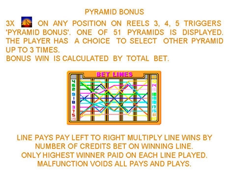 Третьим специальным символом выступает бонусный знак в виде пирамиды. 3 изображения пирамид открывают игроку бонусный раунд. Призовой раунд открывает перед игроком пять рядов с закрытыми картинками. Один из пяти столбцов будет призовым.