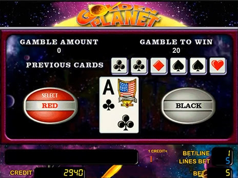 Традиционная рискованная игра для всех разработок автоматов от компании Новоматик не обошла стороной и игровой аппарат Золотая планета. На экране появляются игральные карты. Задача пользователя состоит в том, чтобы предугадать расцветку последующей игровой карты. Правильно сделанный выбор умножает выигрыш от последнего спина в 2 раза. Неправильный выбор приводит к утрате клиентом онлайн казино выплаты за последнее удачного вращение.