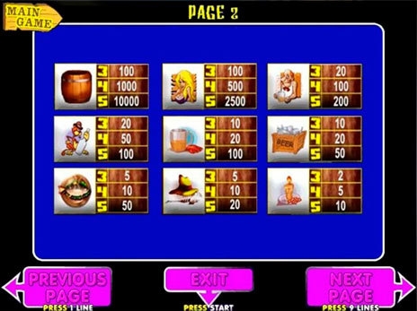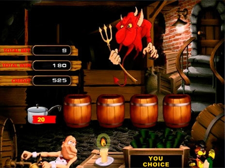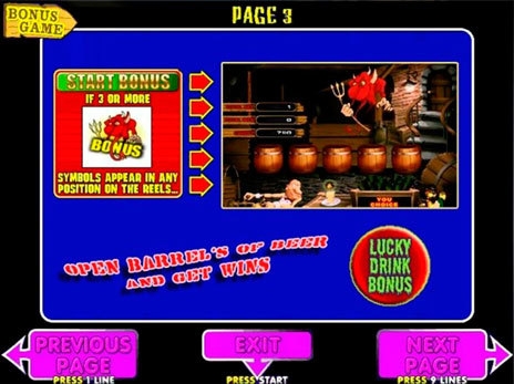 Суть бонусного раунда состоит в том, что игрок должен под бочками обнаруживать ценные призы. На экране появляются 5 деревянных бочонков. В одном из них прячется черт, который в любой момент готов напугать выпившего посетителя. В остальных лежат ценные денежные выплаты.